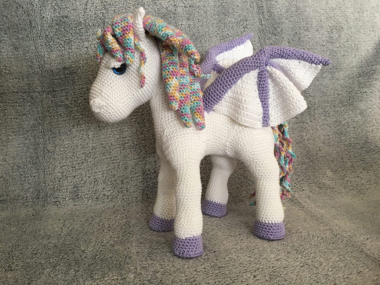 Dieser hübsche Pegasus entstand 2021 und zierte die Schultüte meiner Tochter. Er wurde nach einer Anleitung von Dinegurumi gefertigt, mit eigenen Änderungen an den Beinen.